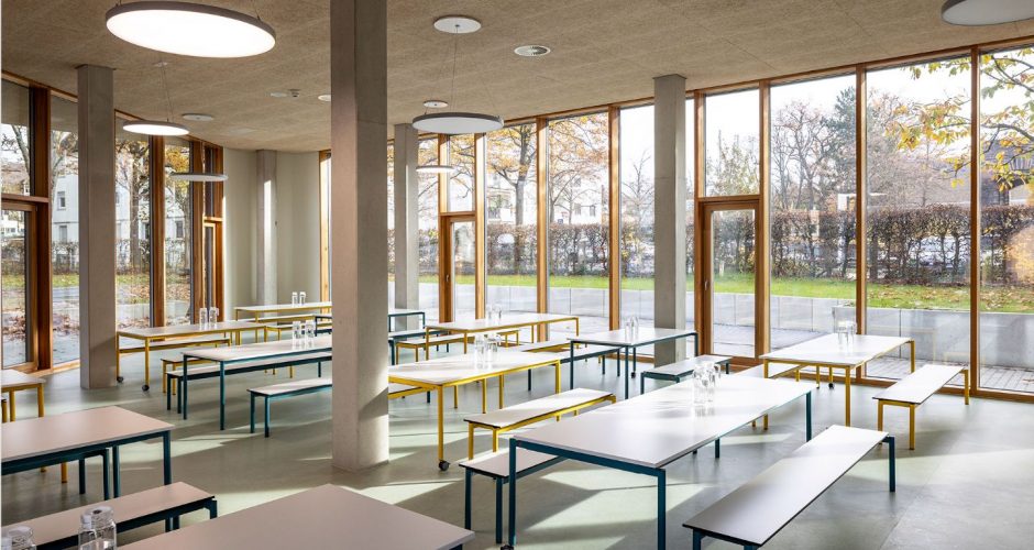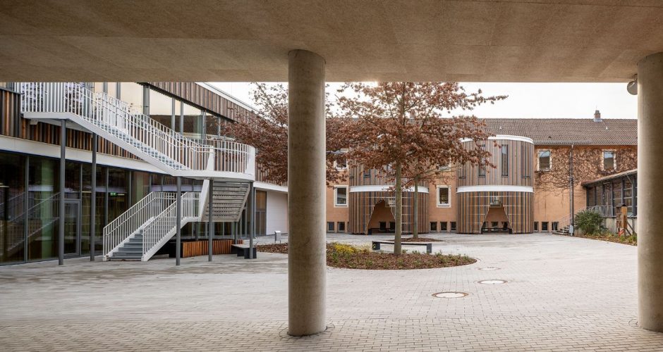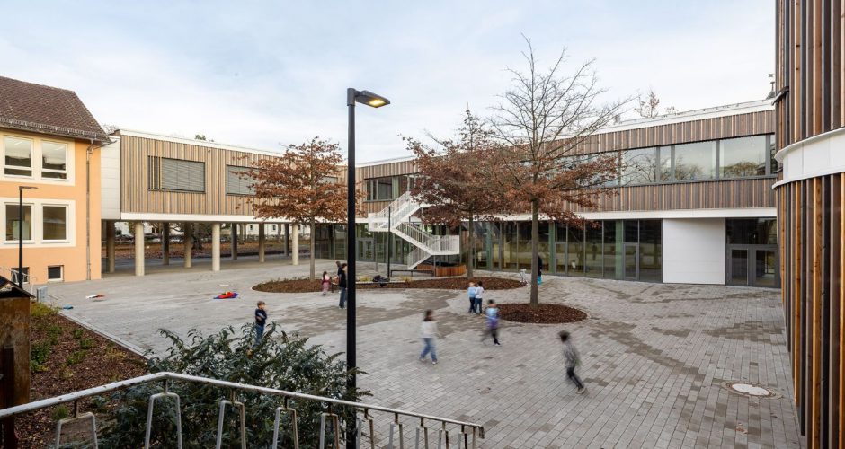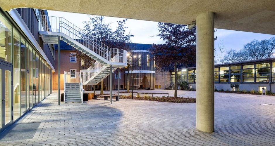 sowie andererseits die Erweiterung der Schule um einen weiteren Klassenzug – mit den entsprechenden erforderlichen Nebenräumen. Inhaltlich geht es hierbei um die nachhaltige Neustrukturierung der Schule insgesamt. Der Neubau soll nicht einfach als neues Element neben die alte Schule gestellt werden, vielmehr geht es darum mit dem neuen Baukörper einen baulichen und inhaltlichen „Ringschluss“ zu schaffen, der zu einer neuen (komplett barrierefreien) Erschließung führt, der neue Innen- und Außenräume schafft, die interne Organisation der Schule verbessert und mit geringen Eingriffen – der Altbau steht unter Denkmalschutz – auch inhaltliche und bauliche Impulse für die Bestandsgebäude gibt.