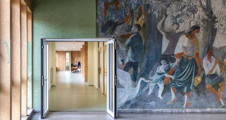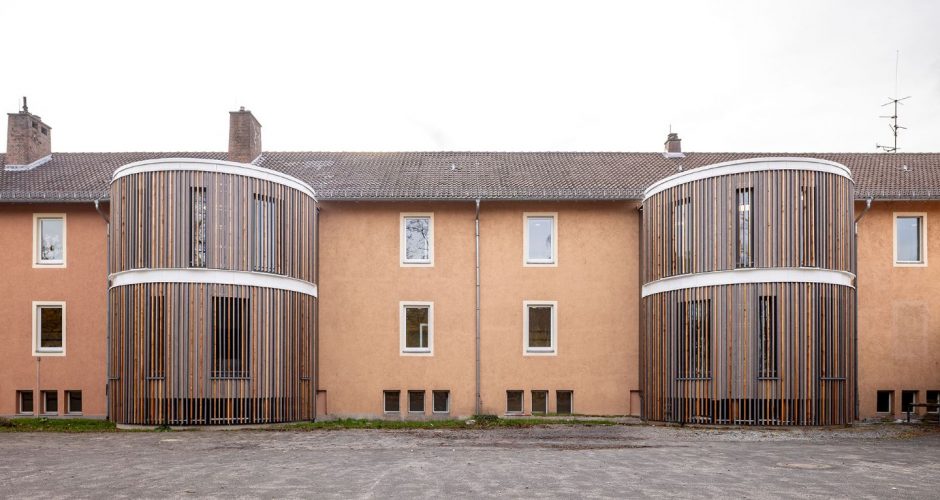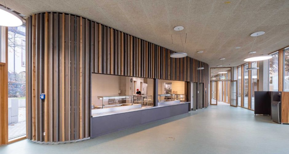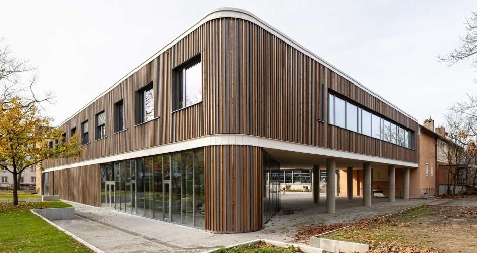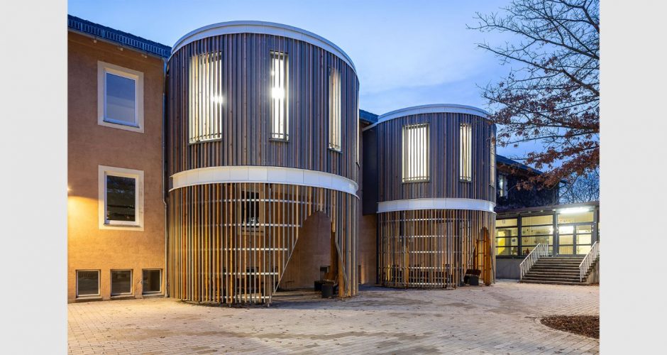 Für die den bestehenden Klassenräumen zuzuordnenden Gruppenräume wird eine besondere Lösung gewählt, die Gruppenräume werden quasi als „Rucksäcke“ als Holzkonstruktion vor die Bestandsfassaden „gehängt“, deutlich lesbar als neue Zutat und Zeitschicht zu den Gebäuden der 50er Jahre.