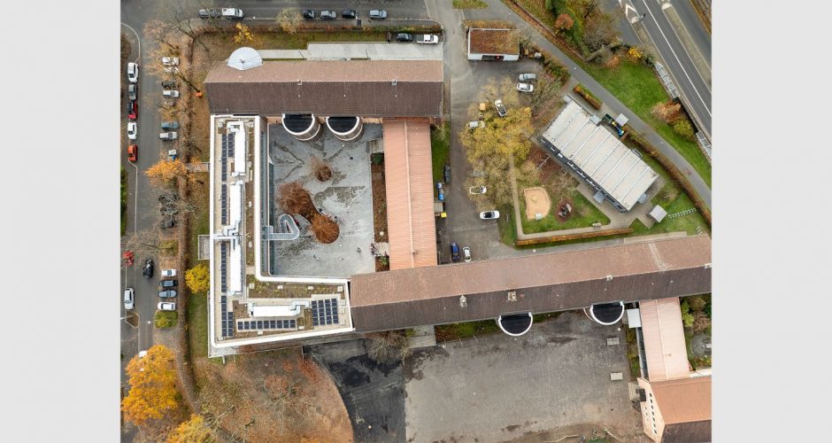 Durch den Anbau des neuen Traktes, der das nördliche Bestandsgebäude mit dem südlichen Bestandsgebäude verbindet, entsteht ein zentraler Innenhof, der als neue Mitte der Schule fungieren kann. Der Innenhof wird im Durchgang des zum Teil aufgeständerten Gebäudes erschlossen, das räumlich einen markanten Eingang bildet. An diesem Innenhof liegen der neue barrierefreie Eingang mit Foyer und Aufzug sowie der ebenerdige Zugang zur Mensa. Im Zuge einer möglichen Neugestaltung dieses Innenhofes wird am linken Rand des Hofes eine große Treppe/ Rampe errichtet, die als weiterer Zugang zur Schule, aber auch als Bühne/ Tribüne für schulische Veranstaltungen dienen kann.